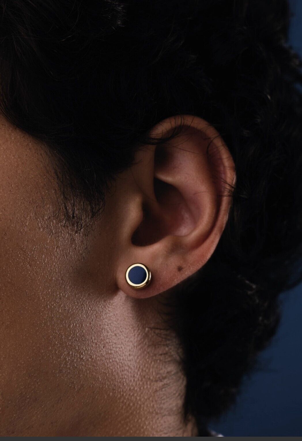 Orecchini a lobo da uomo realizzati in acciaio anallergico rodiato con centrale blu.