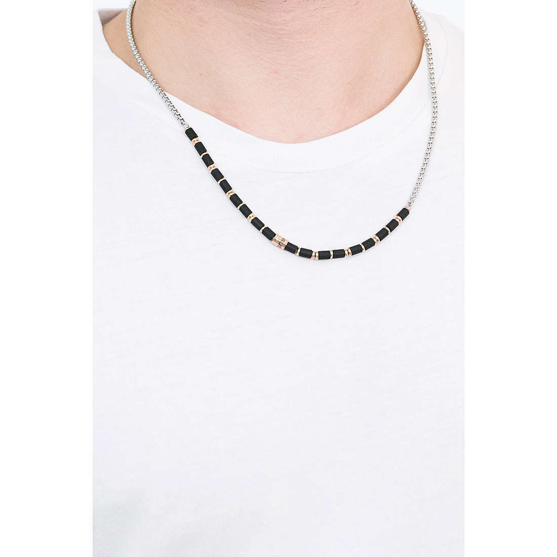 Collana da uomo di 4us Cesare Paciotti della collezione rose rubber. Gioiello realizzato in acciaio, gomma nera e pvd rose gold. Chiusura con moschettone. Lunghezza 55 cm, regolabile a 50 cm.