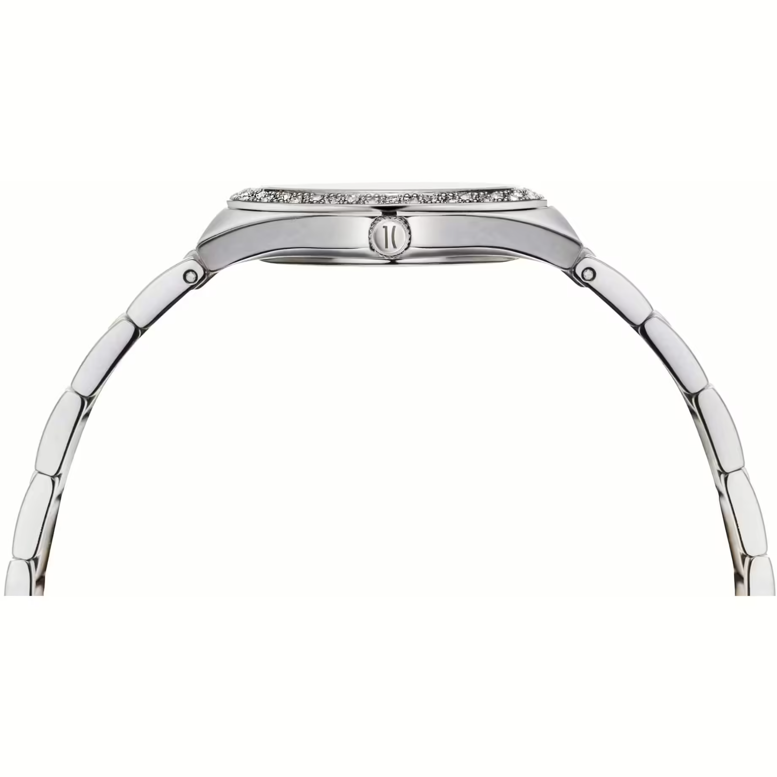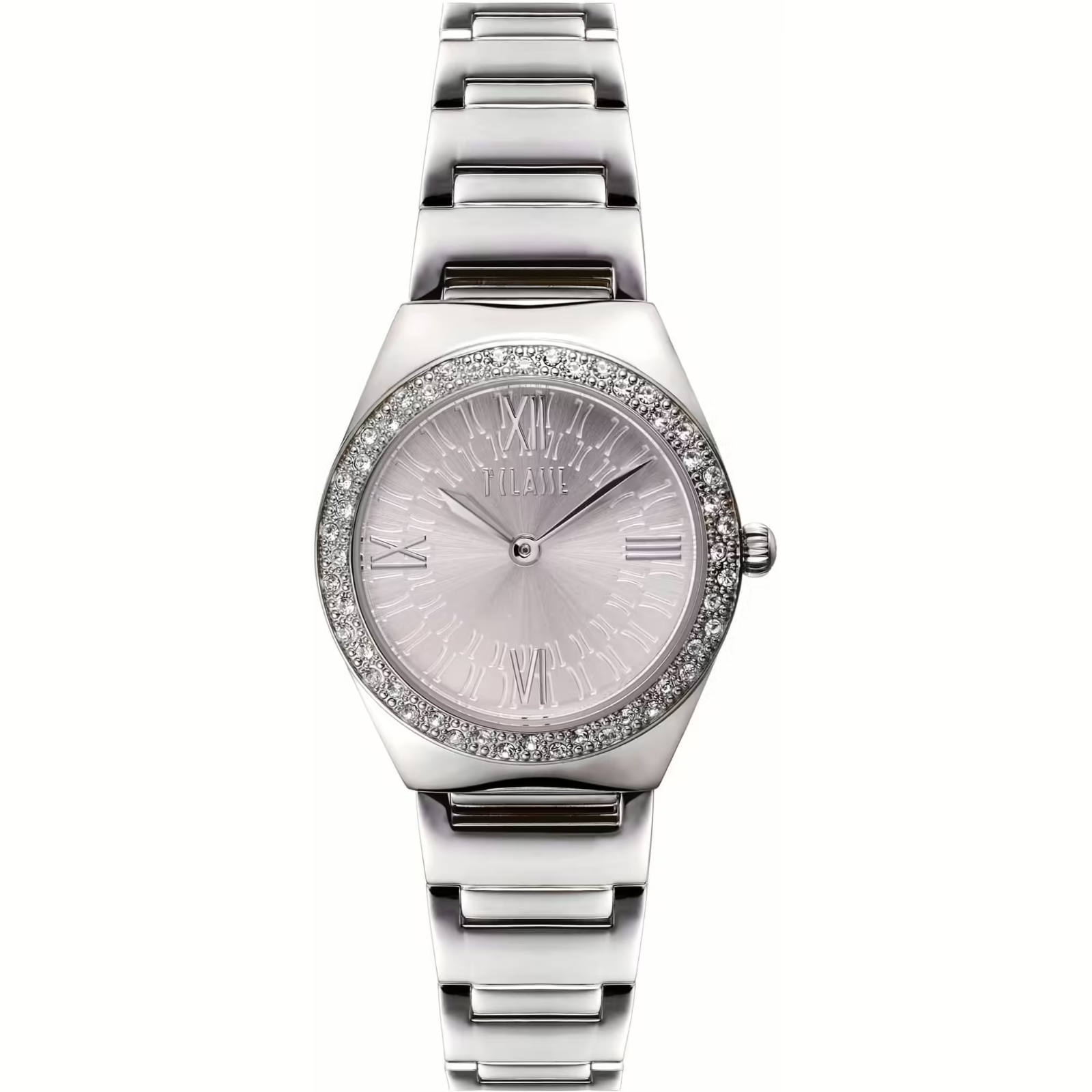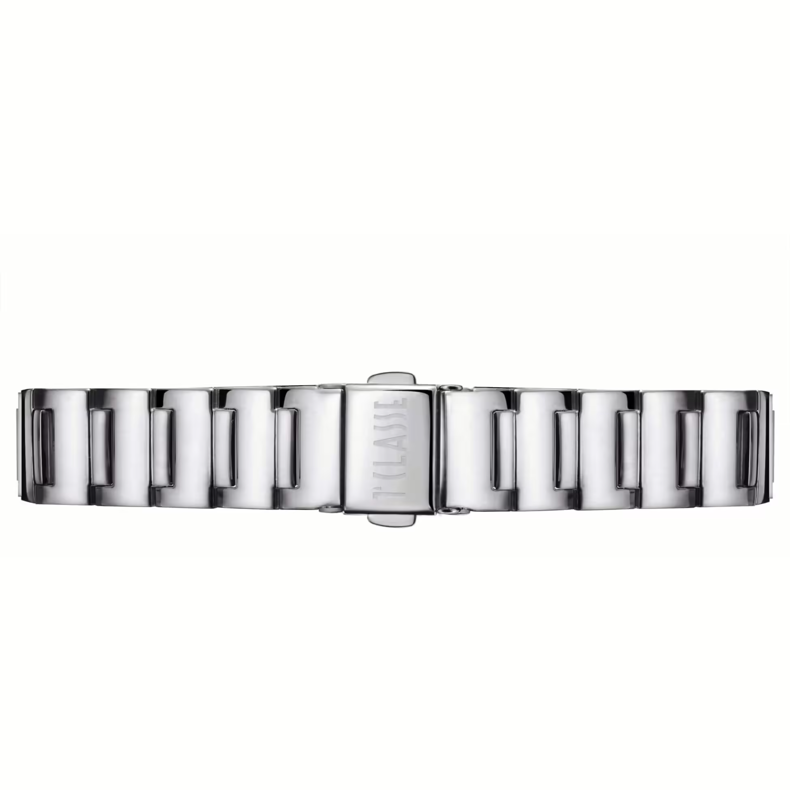 Orologio da donna di Alviero Martini Prima Classe della collezione Notting Hill. Orologio con cassa in acciaio con con cristalli, diametro di 30 mm. Quadrante con pattern argento. Bracciale in acciaio con chiusura déployante. La resistena all’acqua è di 3 ATM. La referenza è:AC00500010101B01.