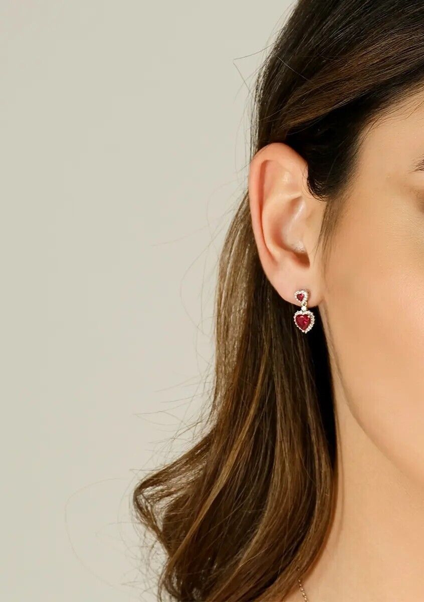 Orecchini pendenti in argento 925 rodiato con due zirconi rossi taglio cuore contornati da zirconi bianchi. Lunghezza totale degli orecchini: 1,8 cm. Lo zircone taglio cuore più grande ha diametro Ø 7 mm. Chiusura con farfallina.