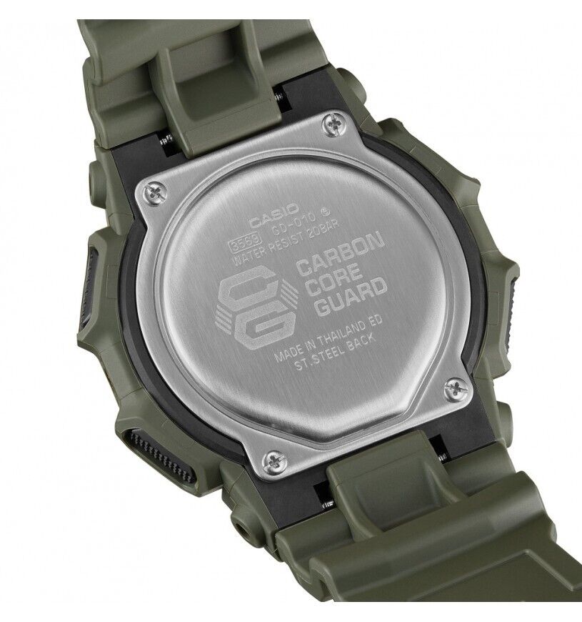 Orologio da uomo multifunzione con movimento al quarzo. Cassa antiurto realizzata in resina nera dalle dimensioni di 54,9 mm x 51,9 mm e spessore di 16,1 mm. E’ rinforzata dal carbonio per garantire resistenza e una tenuta impeccabile nel tempo. Fondello in acciaio inox. Quadrante digitale protetto da un robusto vetro minerale antigraffio. Sul display è possibile visualizzare l’orario in formato 12 o 24 ore, il datario automatico, la sveglia e le funzioni attive. Illuminazione LED del quadrante automatica. Cinturino in resina verde militare; chiusura con fibbia ardiglione. Funzioni di cronometro con accuratezza di 1 centesimo di secondo, timer per il conto alla rovescia e possibilità di inserire fino a 5 sveglie giornaliere. Funzione multi time con visualizzazione di 4 fusi orari simultaneamente. La batteria ha durata di circa 10 anni. Resistente all’acqua fino a 200 metri di profondità.