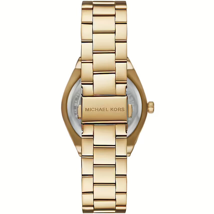 Orologio da donna di Michael Kors Watch della collezione Lennox. La cassa è in acciaio inossidabile con finitura lucida di colore gold. Ha dimensioni di 37 mm e spessore di 9 mm. Il colore del vetro è trasparente e il quadrante è di colore multicolor. La distanza delle anse è di 20 mm. Il cinturino è in acciaio inossidabile con finitura lucida di colore gold. Il cinturino è un bracciale con chiusura deployante. La resistenza all’acqua è di 5 ATM. Il movimento è al quarzo / 3 sfere.