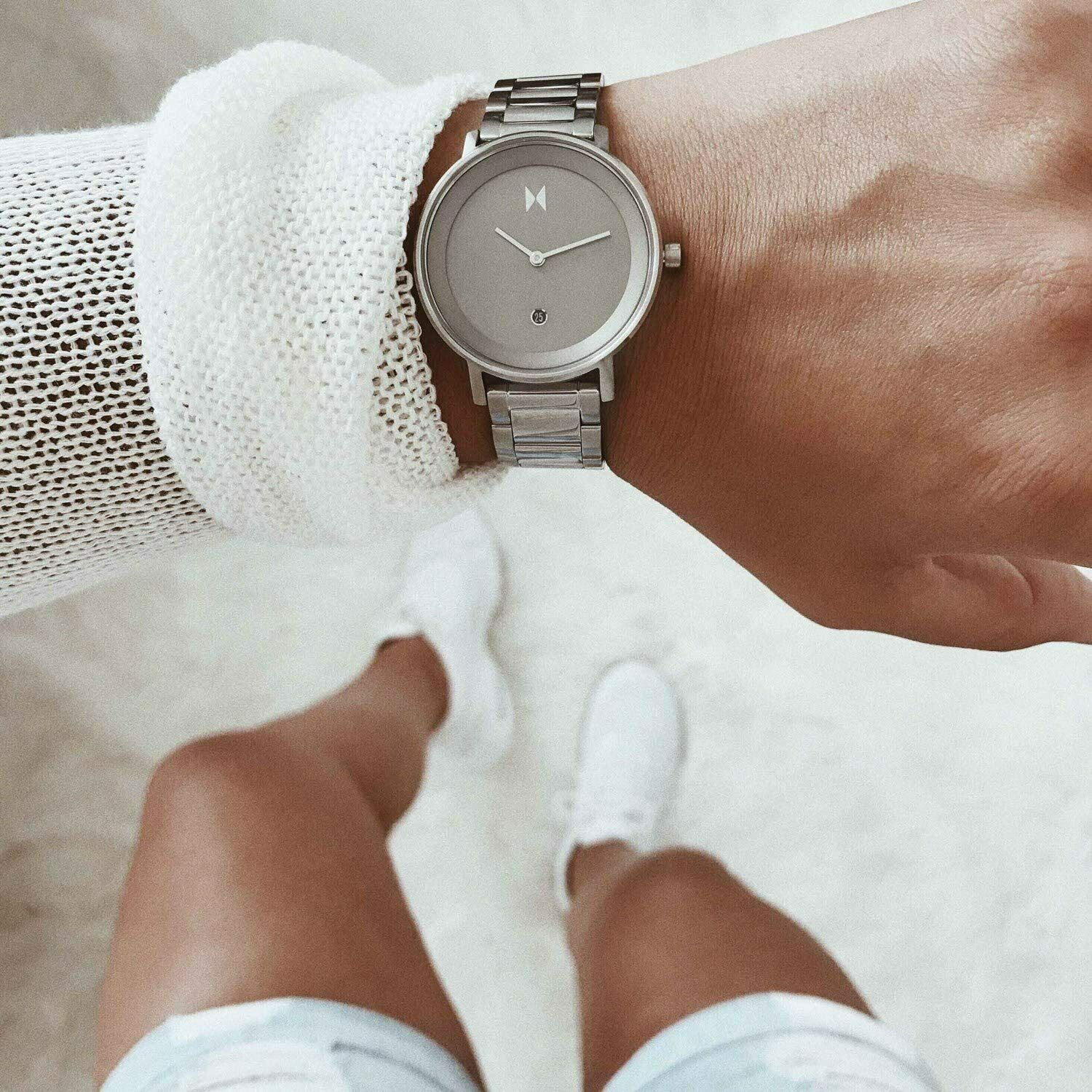 Orologio con cassa in acciaio di forma rotonda del diametro di 34 MM. Modello con cinturino in acciaio, resistenza all’acqua di 5 atm e movimento al quarzo Miyota.