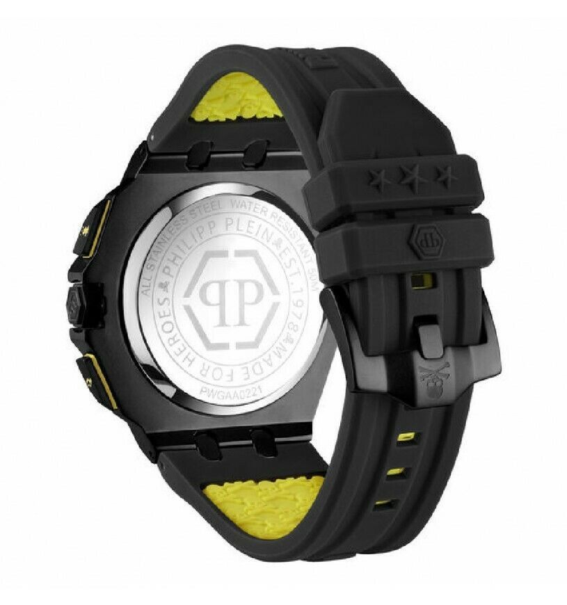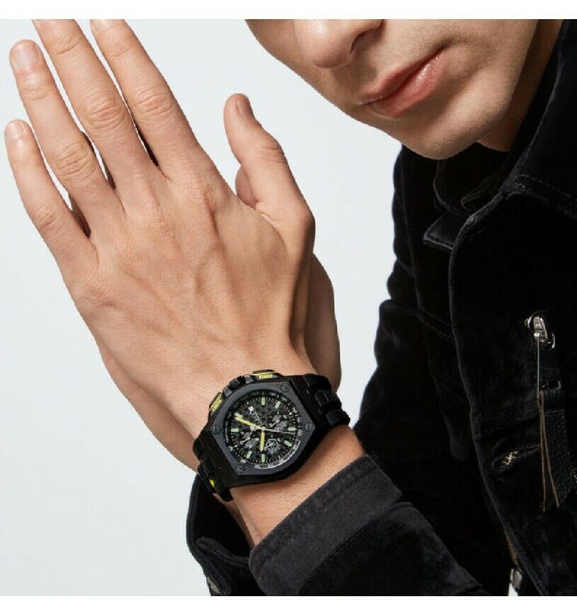 Orologio da uomo con movimento al quarzo vd57 e funzioni di cronografo con data. Cassa in acciaio anallergico con trattamento ip nero. Ha diametro di 44 mm e spessore di 13,2 mm. Lunetta con viti esagonali. Quadrante nero con elementi esagonali, indici a bastoni e datario a ore 3. Cinturino in silicone nero largo 26,8 mm; chiusura con fibbia ardiglione. Resistente all’acqua fino a 50 metri di profondità.