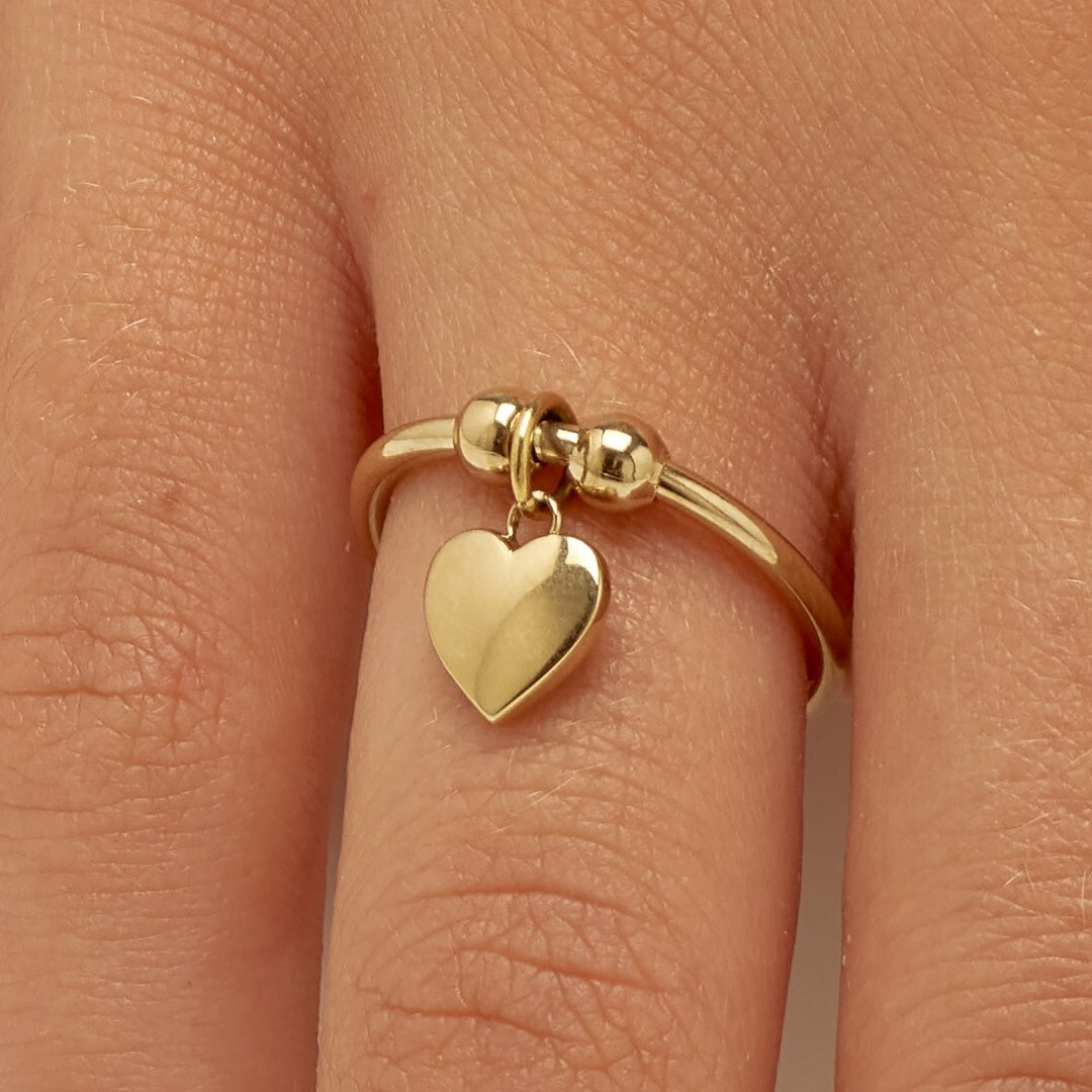 Anello regolabile in acciaio 316L e finitura pvd oro con sfere in acciaio e pendente a forma di cuore.