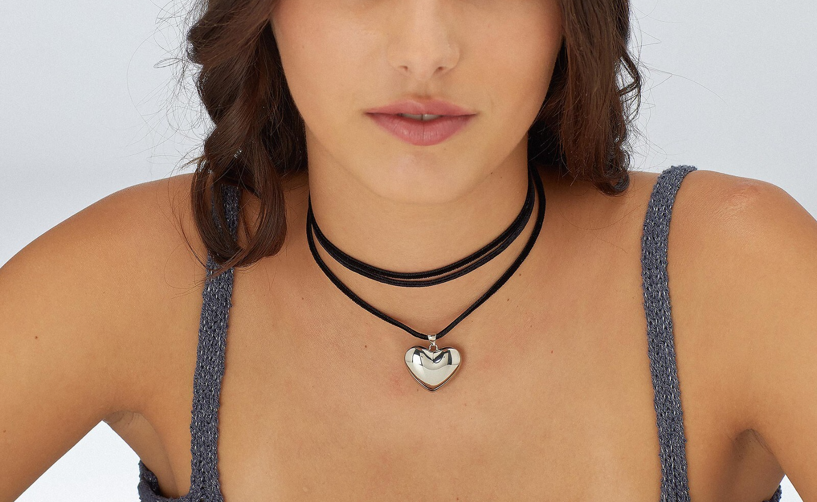 Choker in velluto nero con pendente in acciaio 316L a forma di cuore.