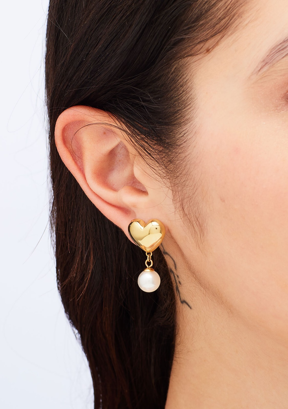 Orecchini pendenti in acciaio 316L pvd oro giallo a forma di cuore con perle di conchiglia.