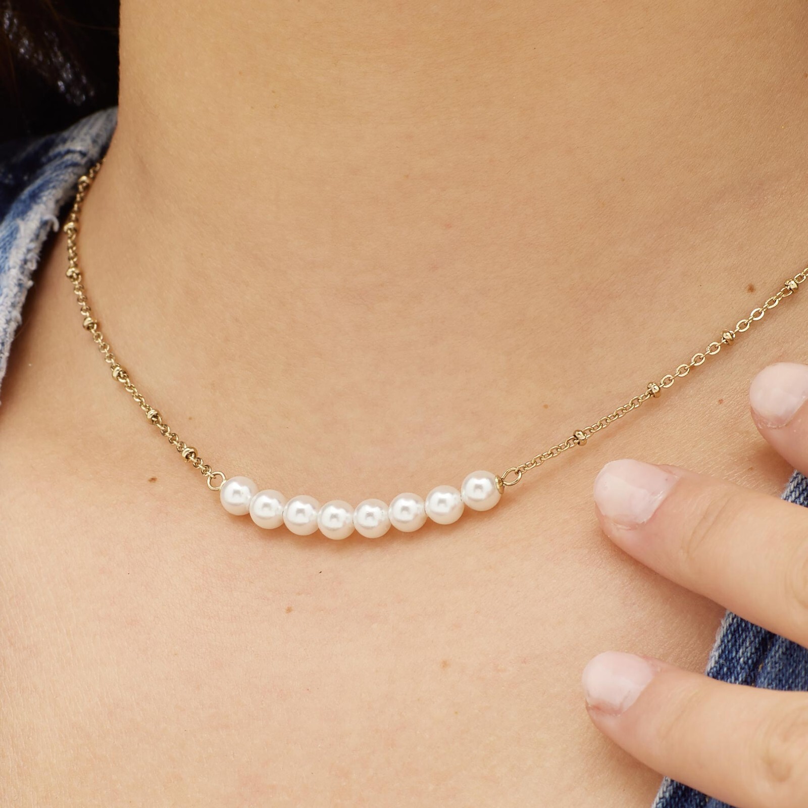 Collana girocollo in acciaio 316L pvd oro giallo con perle di conchiglia centrali.