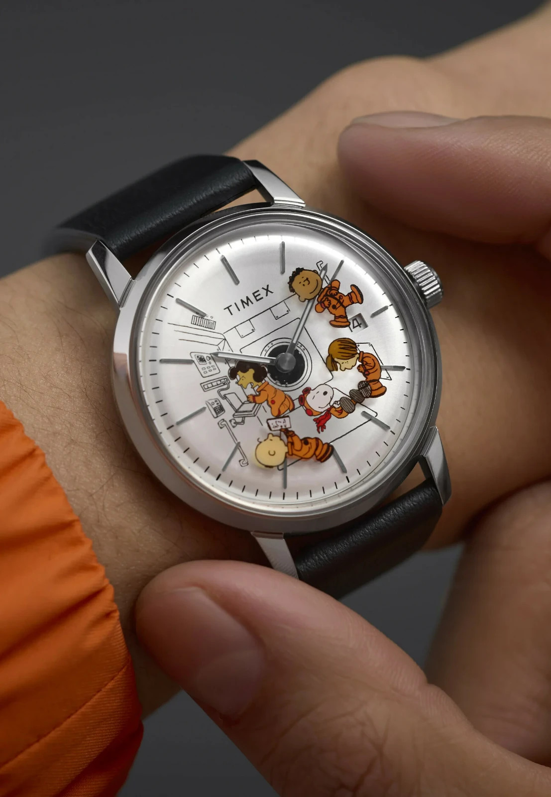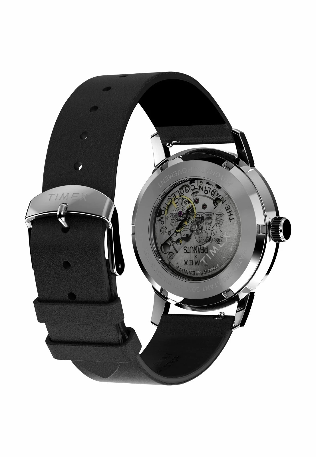 Orologio da uomo con movimento automatico e funzioni di solo tempo con data. Cassa rotonda in acciaio inox dal diametro di 40 mm. Quadrante Silver con con l’iconico personaggio del fumetto di Charles Schultz, Snoppy. Indici applicati, logo nella parte alta e datario a ore 3. Vetro acrilico. Cinturino in pelle nera chiusura ardiglione. Resistente all’acqua fino a 50 metri di profondità.